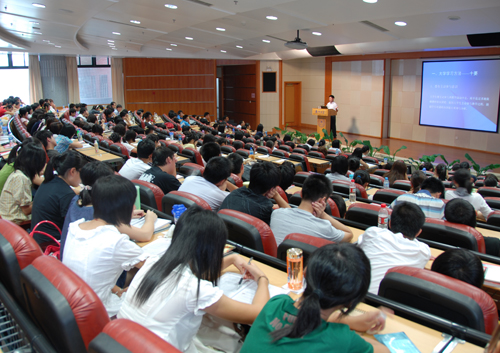 “报告厅虽然比较正式,其实它还是一个教室。”朱主任笑着对09级新生说,“这就是一堂课,我和大家一起思考探讨,如果发现问题可以随时提。”在将近2个小时的课堂中,朱主任重点向同学们介绍了大学的学习方法。