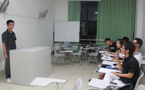 走廊上,新生们都在探讨着面试的问题,有的在一旁思索准备着。要进教室进行面试时,他们会相互鼓励相互加油。考官们大都采取聊天的方式与新生进行交流,主要还是在考验他们的口头表达能力和应变能力。现场,有些部长们还会采取“实战”的方式,实践部部长黄聪达介绍,“我们在面试的时候会模拟一个场景,比如我是某电视台台长,新生要怎么去说服我答应让他们去参观电视台。”