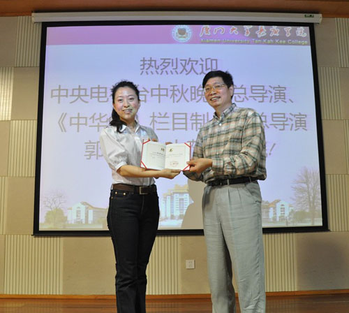 6月11日下午,中央电视台中秋晚会总导演、《中华情》栏目制作人兼总导演郭霁红女士莅临我院,在主楼群3号楼1楼小报告厅展开了一场主题为“电视节目策划与包装”的精彩讲座。讲座的末尾,人文与传播学院苏新春院长宣布正式聘请郭霁红女士为人文与传播学院的客座教授。