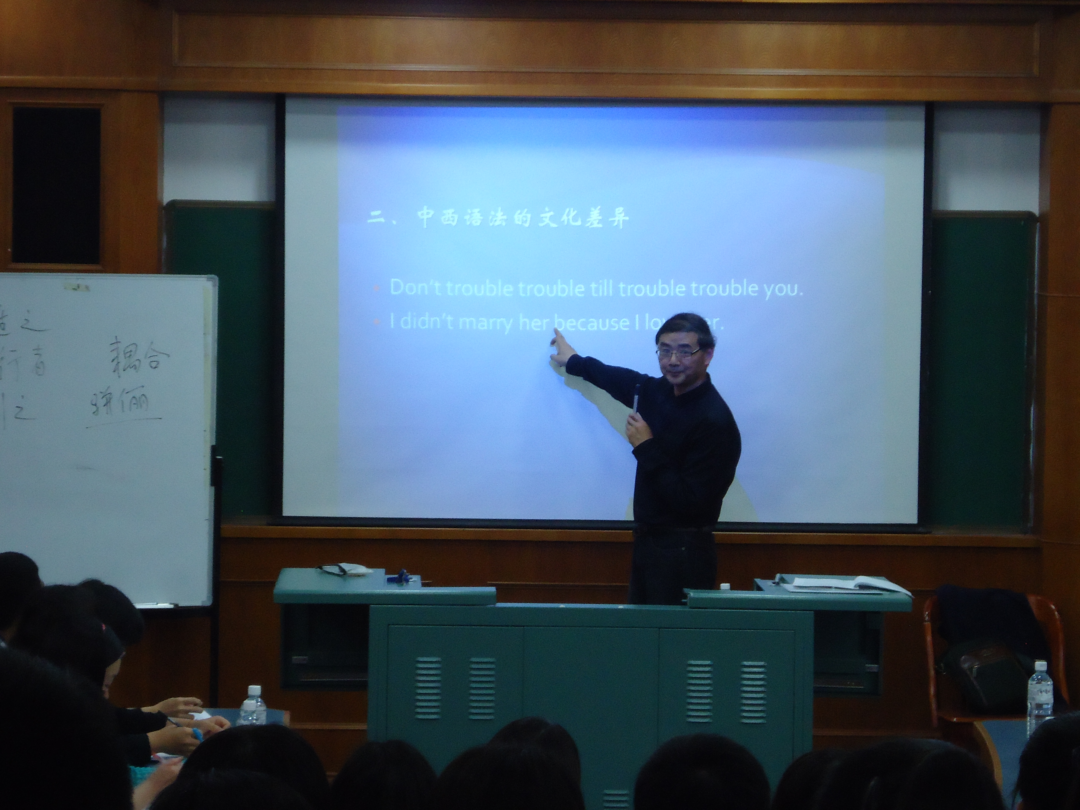 之后,他通过一些学生在日常学习中碰到的翻译问题,进一步向同学们阐述了中西语法上的差异,从而引申出中西文化差异。申小龙教授表示:“从语法中可以看出,中国语言表达讲求灵活,注重语境与言外之意;而西方语言表达注重形式,重视语言表达的准确性。总而言之,中文的语言表达注重“听者”,即对语言的领悟,而西方语言注重“说者”,即语言的精确度。