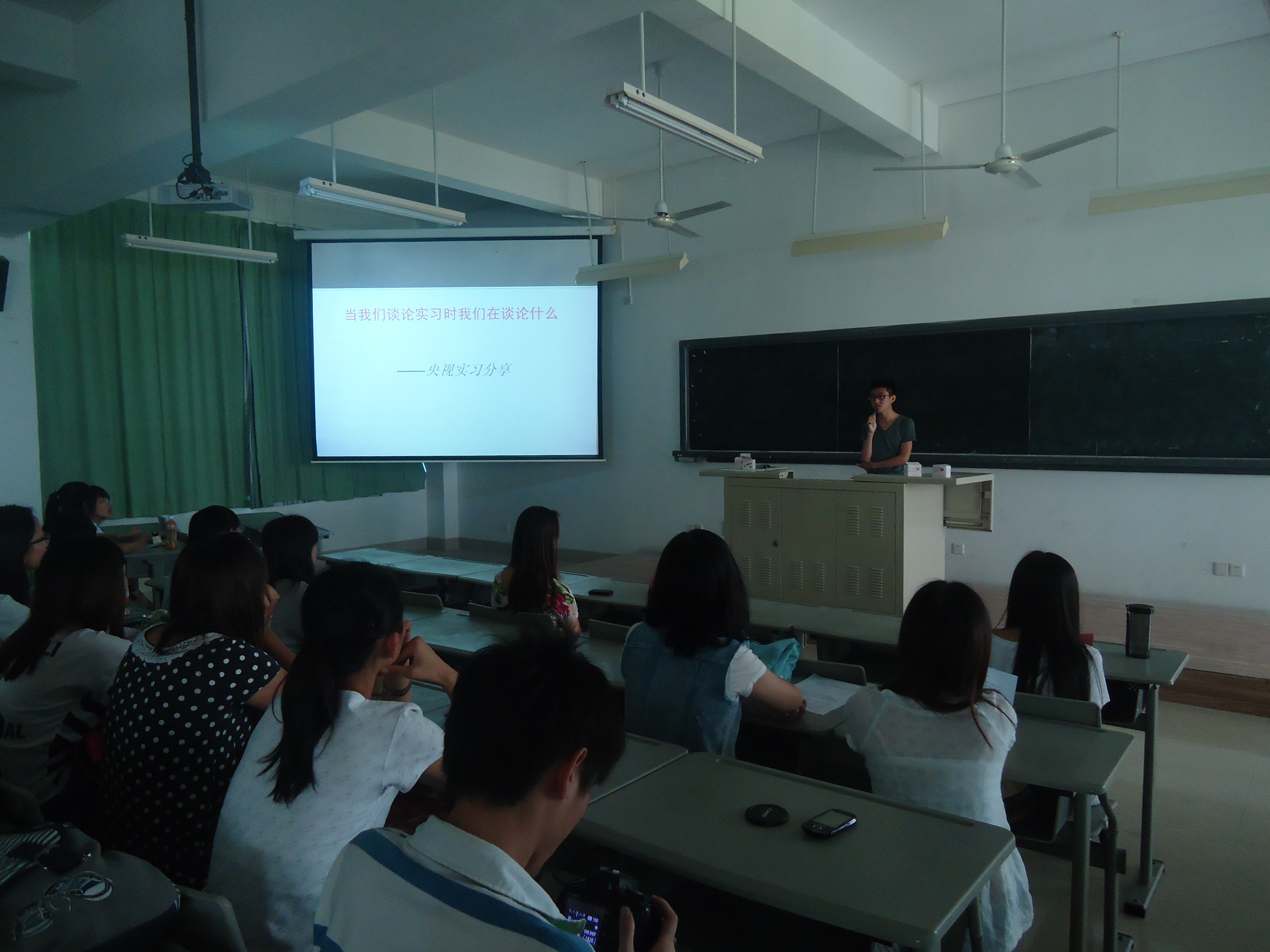 首先上台演说的的,是09级的优秀学长赵子航,就他在央视实习的经历,向大家展示了一组以“当我们在谈论实习时我们在谈论什么”为题的PPT。他结合自己暑期在央视实习的经历,跟在场同学们分享了他的宝贵经验,阐明了自己的收获、感悟,并真诚建议大家能好好利用大学期间的暑假,让暑假生活变得更有意义更有价值。他强调在参与体验上述的学习工作过程中,他学习到了优秀的团队合作精神,见识了优秀的领导风范、感受了高效办事风格和做事态度,扩大自己的人际关系、提高自己的社交能力(尤其是沟通能力和沟通技巧),广泛接触社会,获得更多、更大的社会体验。期中最重要的,就是提高了自己做事的认真性、主动性和责任感,提高自己的独立思考能力,以及独自解决问题的能力。在同学们热烈的掌声中,赵子航学长结束了他的成果展示。
