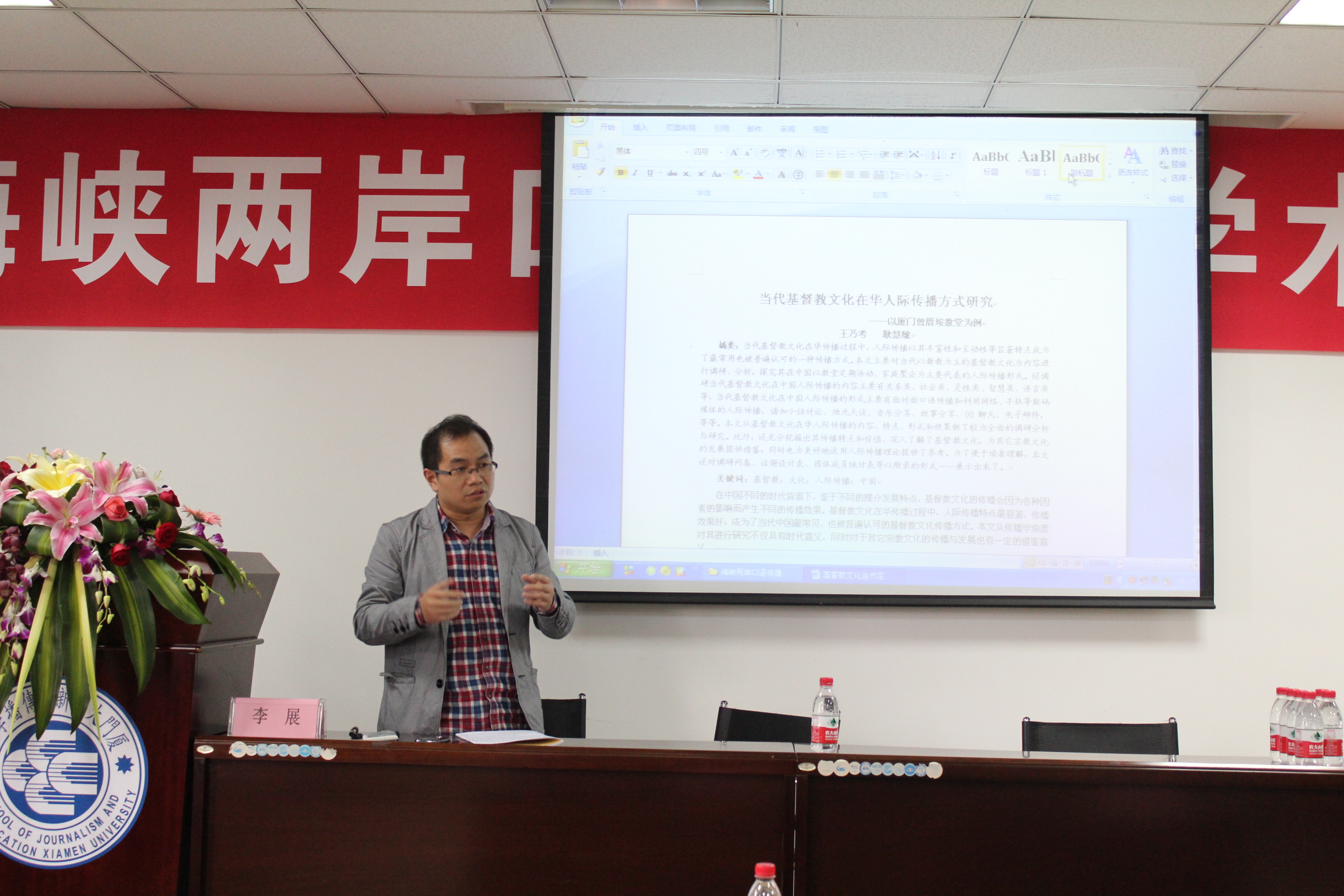 同日下午,王乃考老师在海峡两岸口语传播学术研讨会上介绍了参会主题论文《当代基督教文化在华人际传播方式研究》的研究目的与成果,指出信仰文化与当代新青年的沟通策略。耿慧敏同学在美国著名口语传播学者张惠晶教授主持的分论坛里做发言,主要介绍了在王乃考老师指导下以曾厝垵教堂为例对当代基督教文化在华人际传播方式与效果方面的研究过程。王乃考老师和耿慧敏同学的论文与发言,受到了分论坛主持人、美国著名口语传播学者张惠晶教授、台湾世新大学、浙江大学、厦门大学等名校传播学者的赞誉。