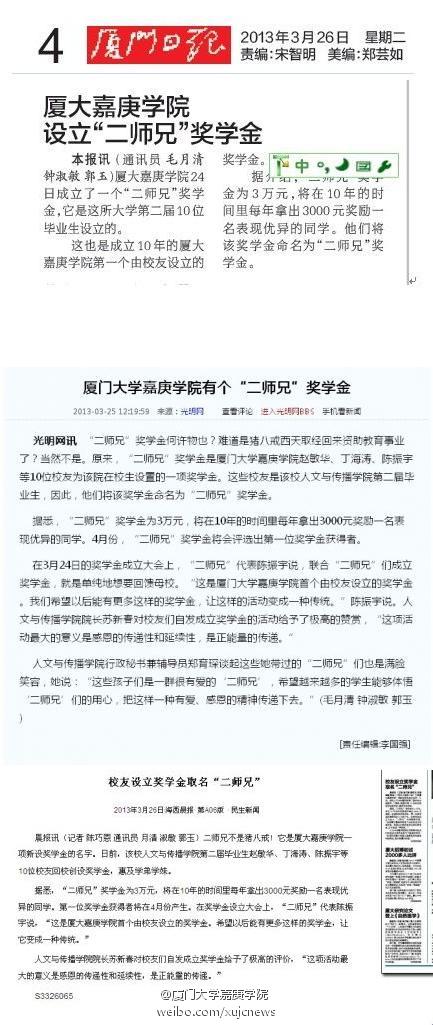 厦门日报、光明网、海西晨报等媒体报道厦门大学嘉庚学院人文与传播学院“二师兄”奖学金的设立。评价说,由已毕业的校友回校设立奖学金激励学弟学妹,是一种感恩的传递与延续,是正能量的传递。