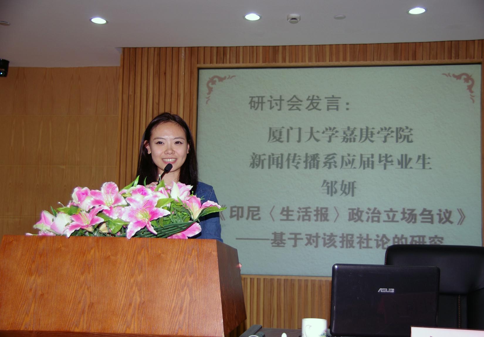 印尼《生活报》是二战结束后印度尼西亚最具影响力的华文报纸之一,1935年创刊于雅加达,是印尼爱国华侨的喉舌,也深受当地民众喜爱。该报创刊68周年之际,世界图书出版公司拟出版一套《生活报》纪念丛书。丛书编委会获悉邹妍的毕业论文后,认为该论文选题准确,观点鲜明,有较高的学术价值,决定将其收入大会文件汇编,并邀请作者在研讨会上做主题发言。她是研讨会上发言的唯一一名本科生,也是论文集年龄最小的作者。
