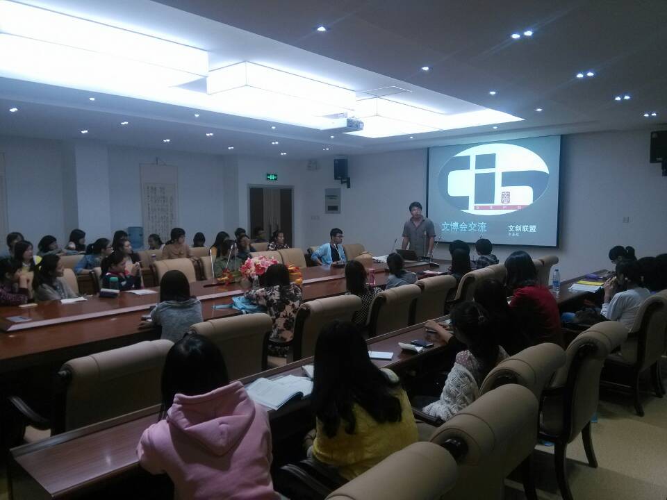 在此次文博交流会上,许多同学发表了自己大胆而独到的想法,虽然刚接触这个专业不久, 但所发表的想法依旧为“文创联盟”的发展做出了不少贡献,会上,文管专业的李嘉超说“文化创意需要其精神内涵,没有精神的文化产品是不为人们接受的,要做出成功的文化产品,最重要的就是要让众人理解其精神,并在这样的文化产品中得到认可。”这段发言作为开场,得到了在场同学的认同与掌声,傅灿辉同学也发表了自己的看法,他认为文化创意需要从细微入手,只有挖掘出文化中的内涵,从细微入手,才能做出成功的文化产品。他不仅提出了自己的看法,还说出了自己灵感的来源,生活之中随处可得的创意。“文化需要深层次的咀嚼。”张佳辉同学这么说道,唯有深层次的理解了文化的内涵,挖掘出其蕴含的人文内涵,加之以自己的创意,才是成功的文化创意,同时,文创人员还需要和各阶层的人群进行交流,不断的扩宽眼界,才能迸发出灵感。