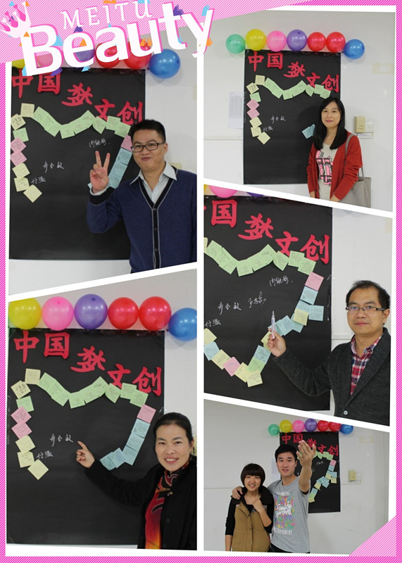 本次班会创意十足,首先整个会场布置就夺人眼球,在黑板四周、讲台上、嘉宾席都放满了各色气球,而在黑板旁用写满愿望的便签纸围成爱心状的“梦想墙”更是一大亮点。“中国梦是民族的梦,也是每个中国人的梦。人生如船,梦想是帆,每个人都有一个只属于自己的梦,但我们同属于一个国家,所以每个人的梦又与国家民族兴衰荣辱紧密相连。”文管专业的团支书张佳辉以一段励志的话语开始了班会。