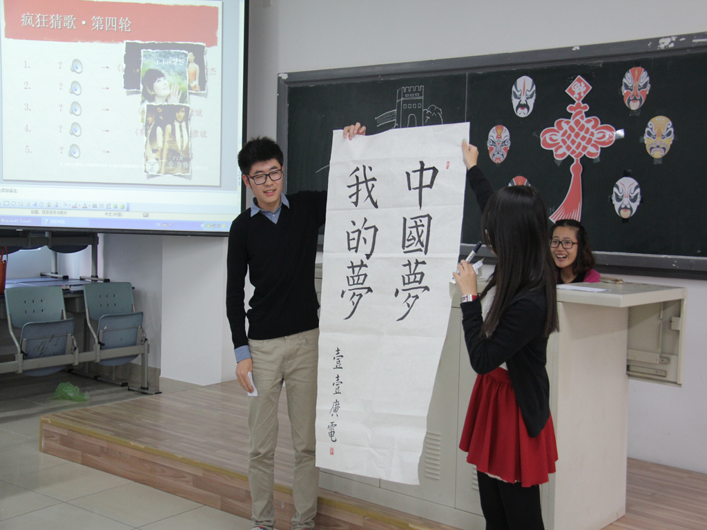 游戏过后,11广电班级自建的小乐队带来了精彩的歌曲演出,现场的气氛也被带入了高潮。此刻站在一旁的王诗卉同学尽显自己的文字功底,现场写下了“中国梦,我的梦”6个大字的墨宝,并把它作为对团会的献礼。全班同学也在主持的发言后纷纷写下了自己的梦想。