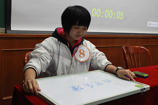轻松一刻过后,令人期待的冠军争夺赛终于开始,脱颖而出的三名选手使出浑身解数答题。由于实力相当,选手们比分紧紧持平,更为比赛增添了几分紧张。最后,凭借生僻字“齑”成功问鼎冠军宝座的厦门大学附属实验中学的吴泓瑄博得了满堂彩,赢得了热烈掌声。经过这三轮比赛,最后决出一等奖一名,二等奖两名,三等奖六名,另外有九名同学获得优秀奖。