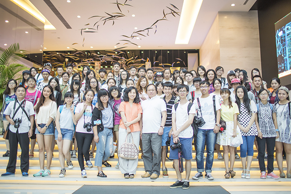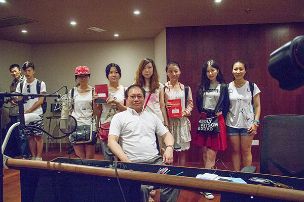 凤凰卫视“台声”张妙阳先生(前排坐者)邀请同学们参观他的工作间,观摩他现场配音。工作结束后,亲切地与大家合影。