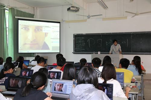 PS培训从页面工具栏的工具逐个讲解,并进行现场演习,学生现场掌握操作技巧,师生互动频繁,学生间交流探讨,场面热烈。