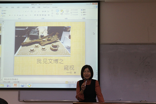 “华侨大学‘微观’世界馆的展品都是贴近生活又具有创意与人性化的,像这个插座有六个面,就可以节省很多空间。此外还有公交车扶手和校园代步自行车。”第四组成员王曼茹同学向大家介绍着她最感兴趣的一个展馆。接着还有可爱的“伊文兔”、“独一无二”的陶艺品、缩小版的鼓浪屿、台湾印象、茶艺、抽象画派……第四组的七位成员全都上台和大家分享了她们的“心”体验,她们的讲解几乎涵盖了此次文博会的各种展品。郑雪龙同学还别有创意地提到“孩子的世界”:漂亮的陶瓷公主、彩色泥人、音乐盒,一下把同学们拉回了孩提时代。