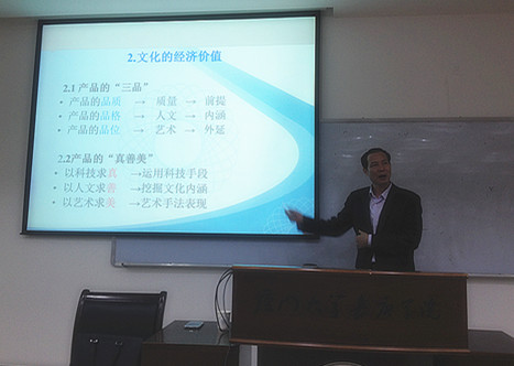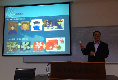 “以文化为灵魂,以创意为核心,以产业为载体。”文化创意产业冗长的专业概念被苏瑞国老师精炼地概括为三句短句。紧接着向同学们展示了文化产业关系图,“传统文化、产品生成、产业行销”三者之间清晰的关系,使初入文创圈子的文管同学们对文化创意产业的运作流程有了清晰的理解。