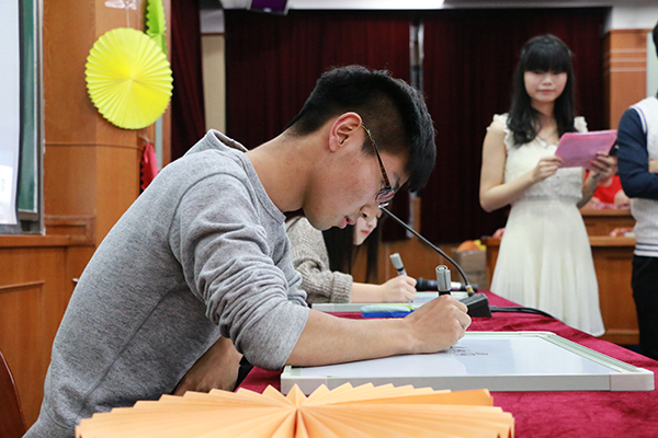 13广告的李思旻同学用一曲《笑红尘》完美开场,比赛正式拉开了大幕。16名选手共分8组进行对决,每组各淘汰一名选手,而8名胜出的选手依然以两人一组的形式进行淘汰赛,决出最终四强。场上的战况十分激烈,“斟酌”、“羞赧”、“桀骜不驯”等这些大家平时司空见惯的字,真要提笔了却也难住了不少同学,但场上选手仍保持镇静的头脑一一应对,展现了不俗的实力。