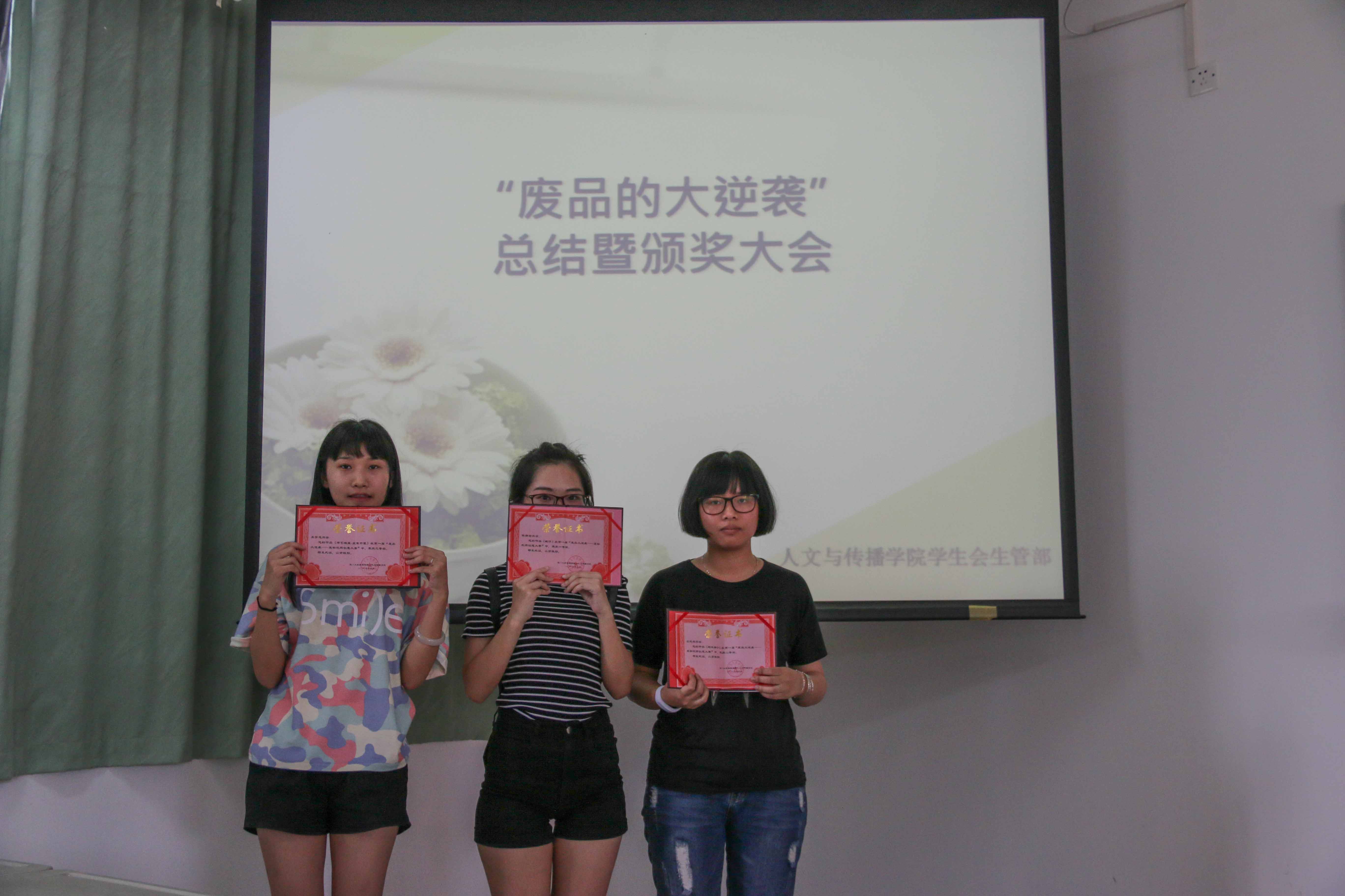 2015年6月2日,由我院举办的第一届“废品大逆袭——废物利用创意大赛 ”在公共教学楼正式落下帷幕,一周内大家通过网络投票的方式在入围的九个作品中选出了最满意的三个,它们分别是第一名陈静瑜同学的《纸曰》、第二名应艳萍同学的《趣味媒介》以及第三名吴梦思同学的《布艺纸篮+盆栽竹筐》,主办方在公1#322教室为获奖者举行了颁奖典礼。