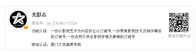 目前,“光影志”得到如“海峡国际湾区”、“微虾米”、“勇川户外”等新媒体公众号的关注,逐步展开与业界具体项目的合作。接下来, “光影志”还将打造一系列的影视文化品牌活动,更将为教师的科研做出贡献,通过打造新媒体平台反哺资源建设,形成良好教育循环的产学研结合。如今,“光影志”又获邀加入“中国高校传媒联盟”,势必为今后提升厦门大学嘉庚学院影视影响力添砖加瓦。