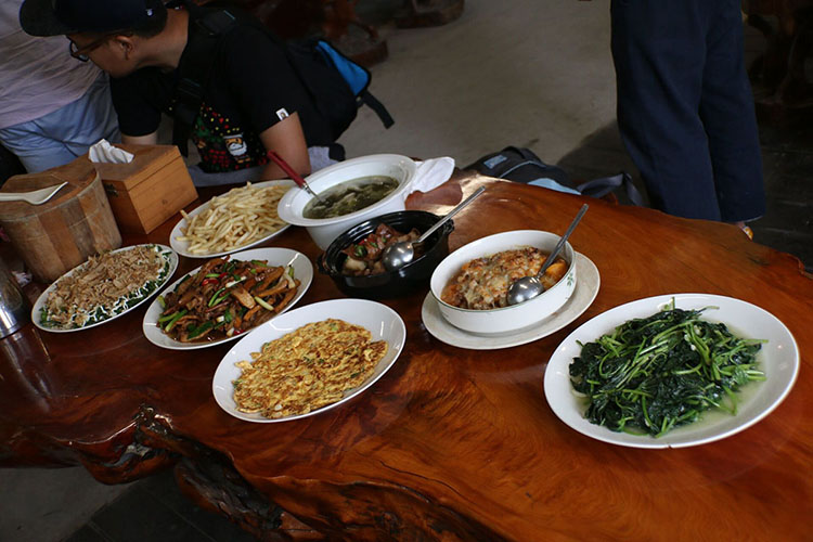 从台北市到苗栗期间有近三个小时的车程,下车后考察团自行参观了片刻苗栗山板樵休闲农场后就到了吃午饭的时间。和前些天不一样的是,今天的午餐显的特别奇特,且不说客家风味的午餐,就连吃饭坐的桌子都令人眼前一亮,充满了客家文化。