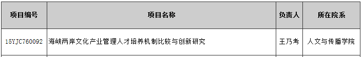 教育部社科项目是教育部主管的政府基金资助项目,层次较高。其中,本年度,我校人文与传播学院王乃考老师的“海峡两岸文化产业管理人才培养机制比较与创新研究”获得了青年基金项目资助立项。