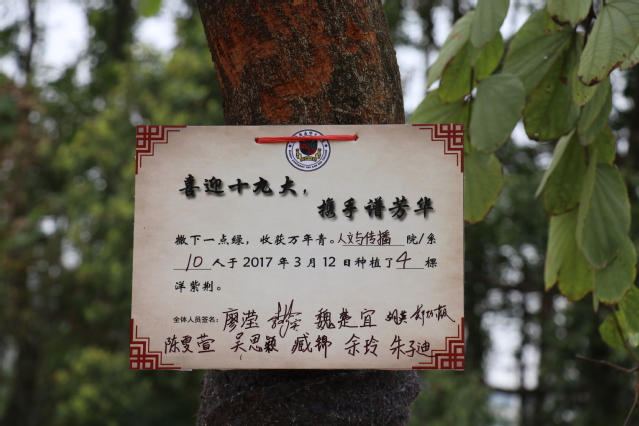 活动后,李梦实部长接受了我们的采访。他说道,“这个植树节对我而言是意义非凡的,我不仅亲手种植了四棵树学会了用铁锹学会了用洋紫荆的叶子折小兔子,我更是为了嘉庚的绿化出了一份力,为这个地球的绿色,为了我们的十九大。”今天没有太阳,但这四颗洋紫荆仍然泛着光傲立在大地上,正如我们人文与传播学院的精神头一般,耸立着直指苍天。