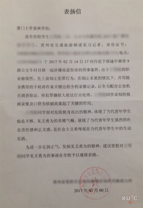 近日,我校收到了一封来自贵州省贵阳市某派出所寄来的表扬信,信中情真意切地赞扬了一位机敏、勇敢的“嘉”人,帮助公安机关打击处理违法行为,她是正在一家媒体进行毕业实习的我院广播电视学专业2013级学生王雪晗,“为进一步弘扬正气,发扬见义勇为的精神,建议贵校对王同学的事迹在全校予以通报表扬。”