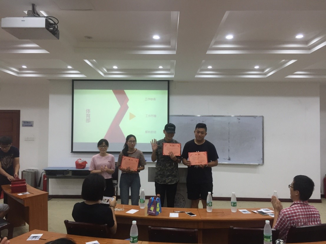 到了颁奖环节,首先颁发的是优秀部门奖,获奖的部门有办公室、体育部和学术部,由王慧玲老师为他们颁奖。其次是优秀部长的颁奖,由孙海岛老师颁奖。