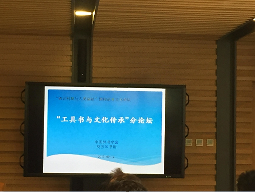 苏新春院长作为“工具书与文化传承”分论坛的座谈特邀嘉宾参加,该分论坛由中国辞书学会与商务印书馆共同承办,分为两个板块,第一个板块为汉语辞书专题。中国社科院语言所江蓝生研究院以“传播中华文化,引导语文规范的璧”为题,向《新华字典》《现代汉语词典》致敬。苏院长则着重以“工具书与中华文化的传承与发展”阐发了我国辞书研究传统与中华文化传承之间微妙默契的关系,以辞书编纂的历时变化实例生动详实地描绘了辞书的编纂、演变与社会历史文化共生、互动、记录以及传承的对应关系。第二个板块为外语辞书专题。中国台湾东吴大学英文系曾太元副教授以几个中国词汇为例,论述《牛津英语词典》中的文化传承元素。法国汉学家魏明德(Benoit Vermander)认为《利氏汉法词典》是双语工具书的大树。与会代表就以上发言进行了热烈的讨论。