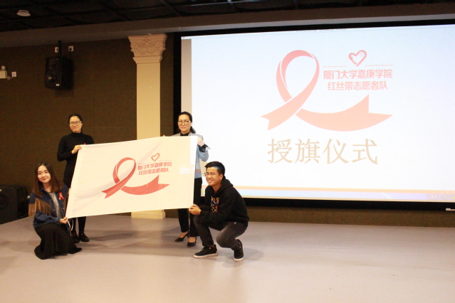 活动开始,李三伟老师和张媚老师为红丝带志愿者队授旗。“厦门大学嘉庚学院红丝带志愿者队”的成立不仅象征着我们对艾滋病人的关心与爱护,更象征着我们对生命的热爱,红丝带志愿者们也会用心参与关于预防艾滋病基本知识的宣传工作,让非歧视原则深入人心。