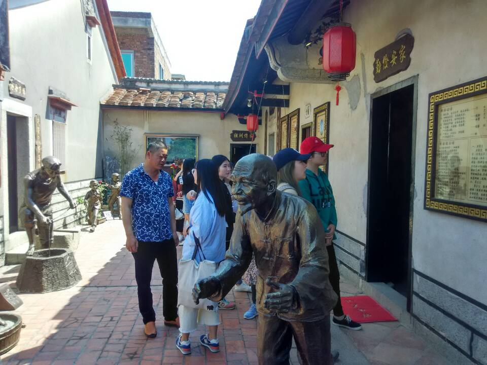 在浮宫镇兰主任的带领下,文管师生一行先参观了流渡笃行馆,该馆为纪念流渡公无私奉献、助人救人的精神而建,是田头村重要精神文明教育场所。沿着乡村小道,师生走进村内的甘山古厝群,参观田头村活化古厝的标杆——归田居。归田居内陈列农家生活用品,也有村情村貌的介绍,还有反映华侨回村的雕像,生动地展示了田头村的田园特色。