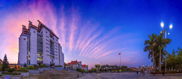 回忆当时创作情景,易欣老师觉得这幅作品是天时、地利、人和的结合,犹如“神来之笔”。“当时我正好下课路过,偶然回头看见天空正在上演精彩的‘晚霞秀’,那天正好身边又带着相机。我见过很多晚霞,也拍过很多,但这样规则的形状还是第一次,也许只有这种地景才配得上这种天象吧。”易欣老师介绍说,根据当时晚霞的位置与形状,他选择了横向接片的方法,全图由15张照片拼接而成。