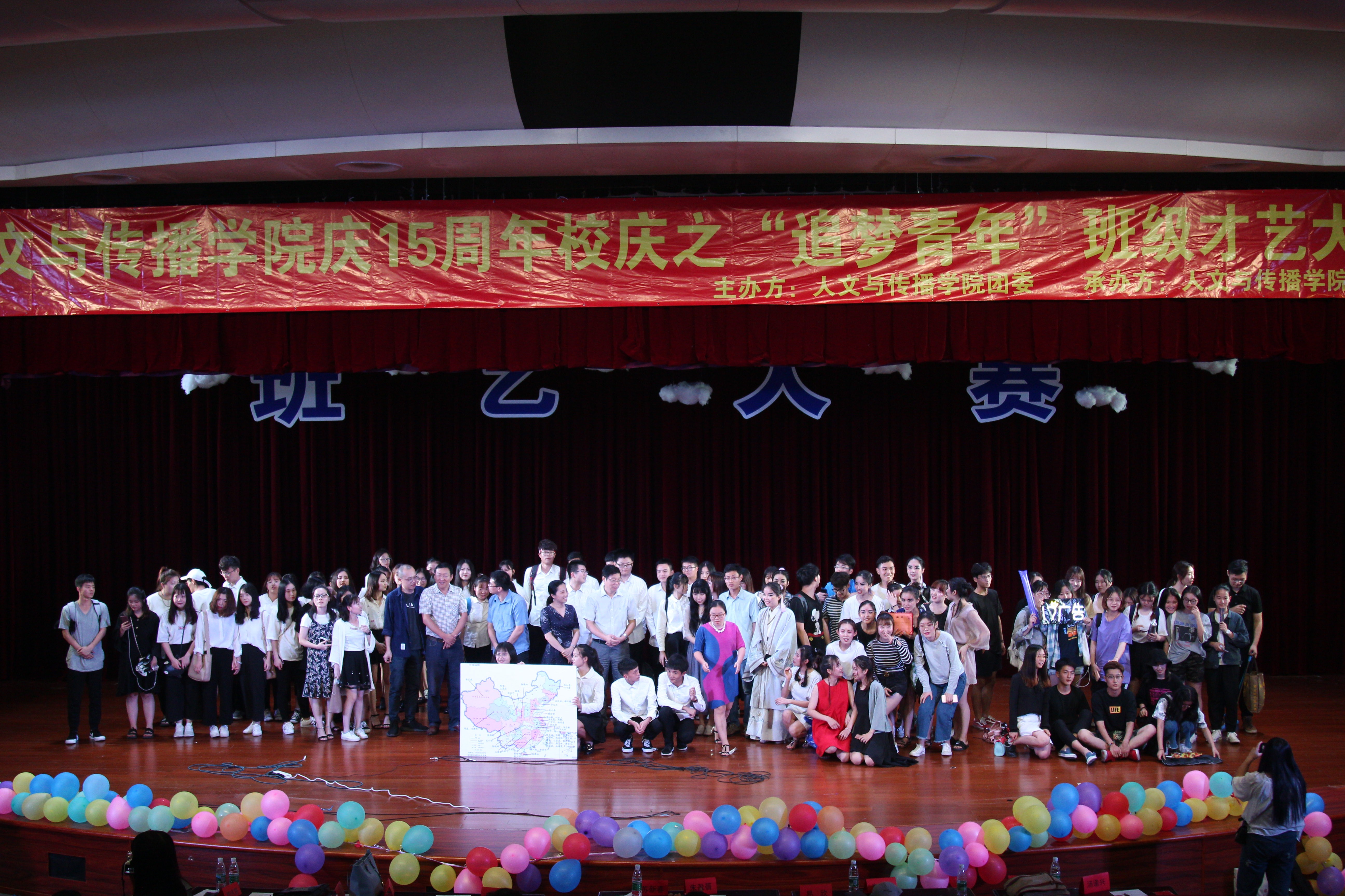 2018年5月8日晚上7点,人文与传播学院庆15周年校庆之“追梦青年”班级才艺大赛决赛在主3楼大报告厅拉开帷幕。来自人文与传播学院新闻学、广告学、广播电视学、文化产业管理、汉语言文学5个专业9个班级的队伍经历初赛,在决赛中挥洒汗水,展现蓬勃朝气。