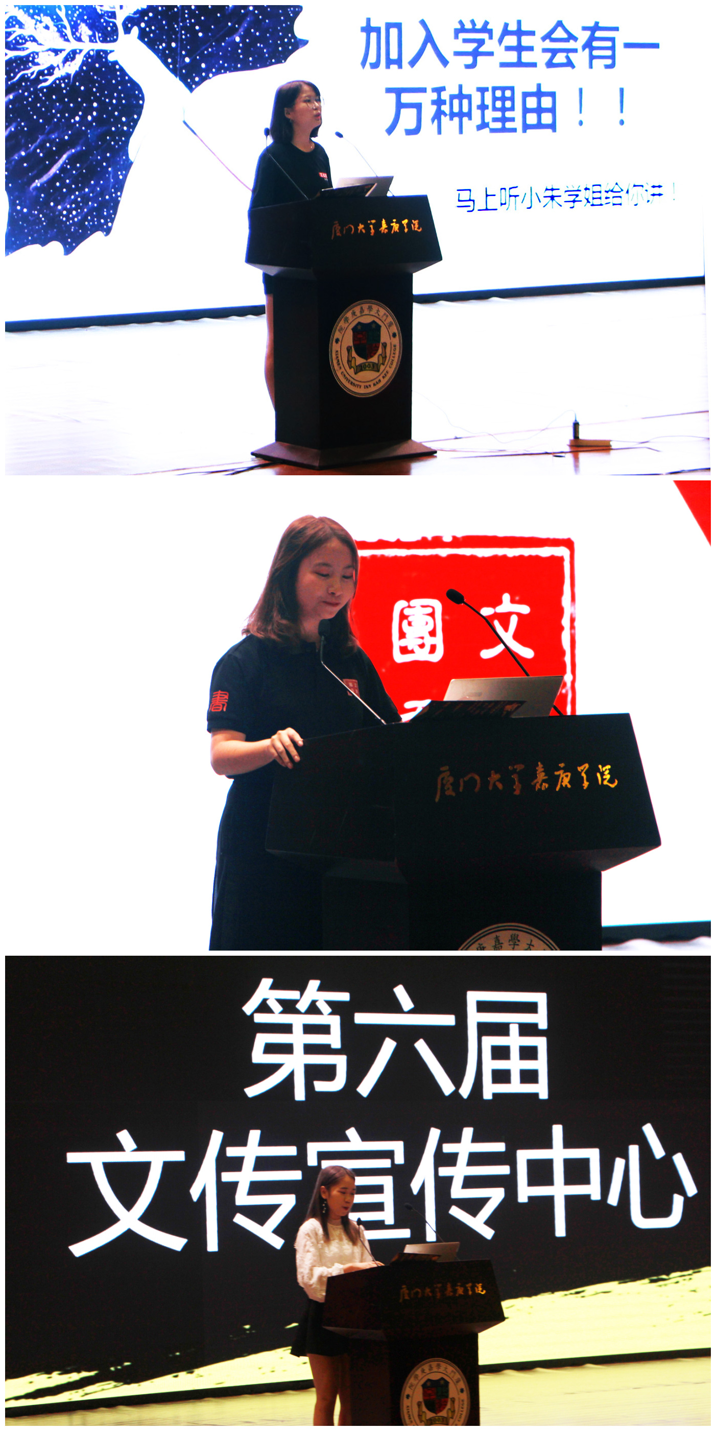 最后,我院学生会、团委、宣传中心的学生代表依次上台,为新生们详细介绍了各自组织的部门和部门的任务。在宣讲过程中,三个组织也播放了各自精心准备的宣传视频。文传院三大组织期待各位新生的加入,祝愿2018级新生们早日适应大学生活,在各自的组织上展示自己的风采。