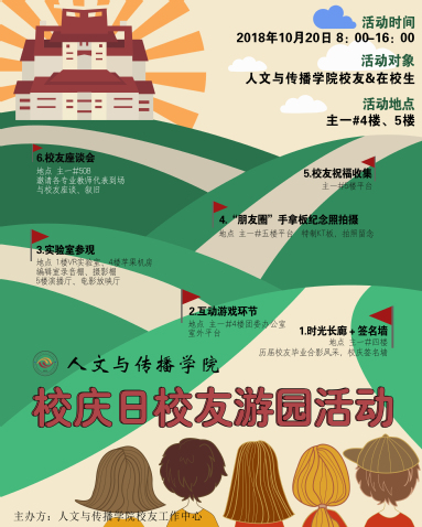 活动含时光长廊+签名墙、实验室参观、互动游戏、校友祝福征集等项目,其中互动游戏环节设置有关院情概况的问答,校友查看纸条内部的问题,知道正确答案即可将纸条撕下,到问答区答题即可获得小礼品(明信片、回形针和文传院纪念品)另外有桌游纸牌、真心话大冒险、时光邮局等互动游戏,参加者也可以获得相应的纪念品。