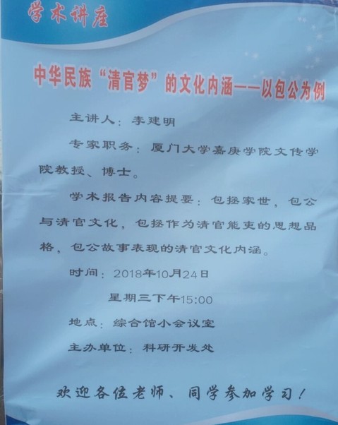 2018年10月24日下午,应漳州职业技术学院邀请,我院李建明教授为这所福建省规模最大的职业技术学院开设了题为《中华民族“清官梦”的文化内涵——以包公为例》的专题讲座,这是李教授最近为福建省百场社会科学专题报告会贡献的第二场讲座。