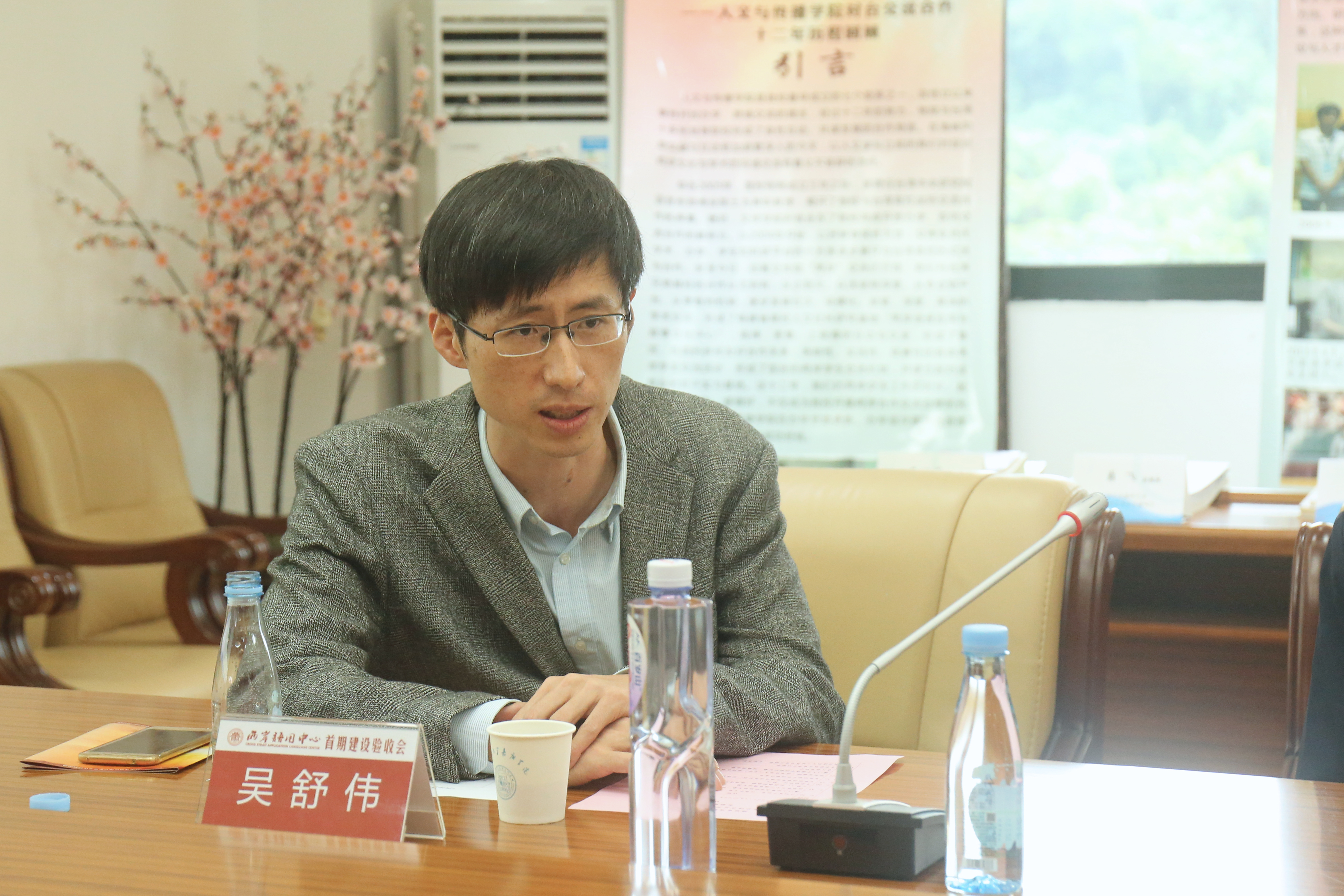 戴一峰副校长致欢迎辞,对省厅领导、各位评审专家表示欢迎,在介绍中他特别指出了两岸语用中心在我校的特别之处——“‘两岸语用中心’是嘉庚学院第一个也是目前为止唯一一个省高校人文社科基地。”