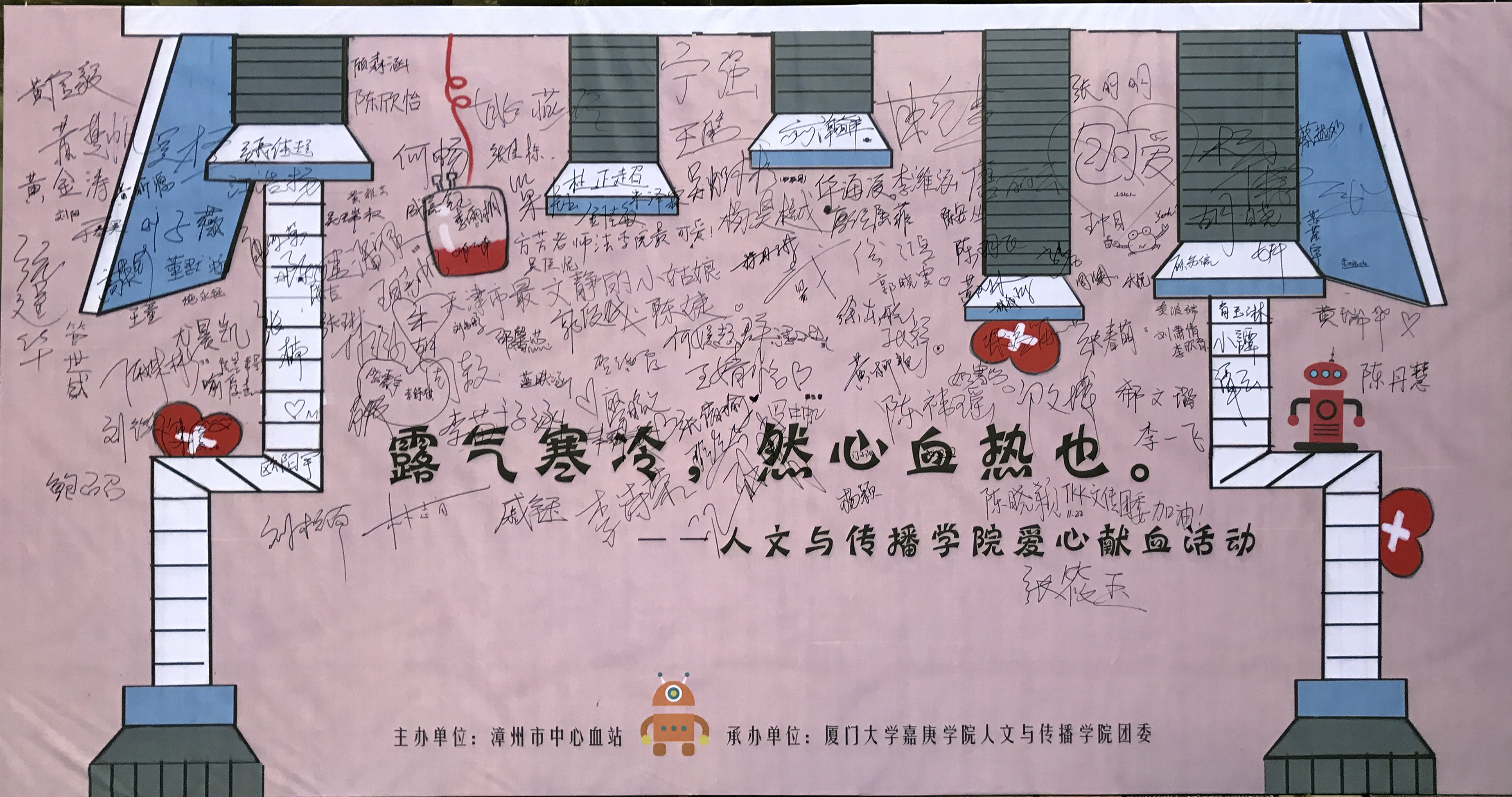 在为期三天的献血活动圆满结束后,展板上是献血者们满满的签名,据不完全统计,此次由漳州市血站主办,人文与传播学院团委承办的无偿献血活动三天献血人数共达401人,献血总量131000毫升。此次献血活动不仅吸引了众多嘉庚学院在校大学生与教职工们奉献爱心,也吸引了不少校外人士,他们虽然来自不同的地方,从事着不同的工作,但此刻都为献血这一项公益事业献出了自己的一点绵薄之力。
