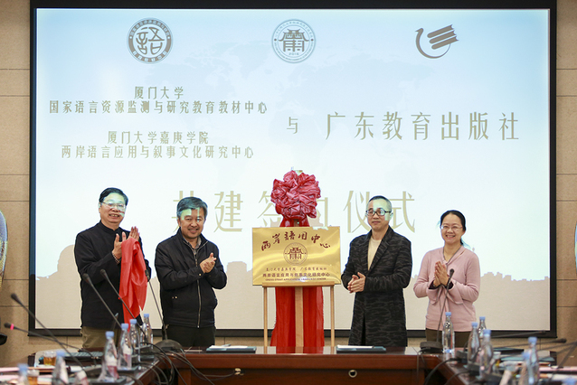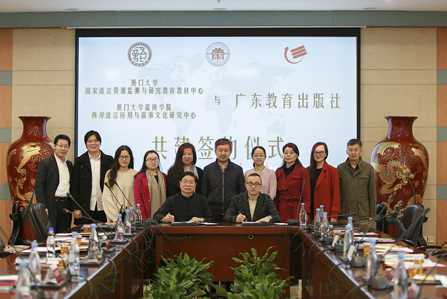 2018年12月14日下午,福建省高校人文社科研究基地“两岸语言应用与叙事文化研究中心”与广东教育出版社在厦门大学颂恩楼215会议室,举行共建签约仪式。出席此次共建签约仪式的有:广东教育出版社副书记副社长李远谋编审,广东教育出版社主任黄倩副编审,厦门大学嘉庚学院副院长刘暾东教授,我中心主任苏新春教授,厦门大学嘉庚学院人文与传播学院党总支书记沈玲教授,我中心副主任杜晶晶副教授,以及语用中心四个研究室的各位老师。