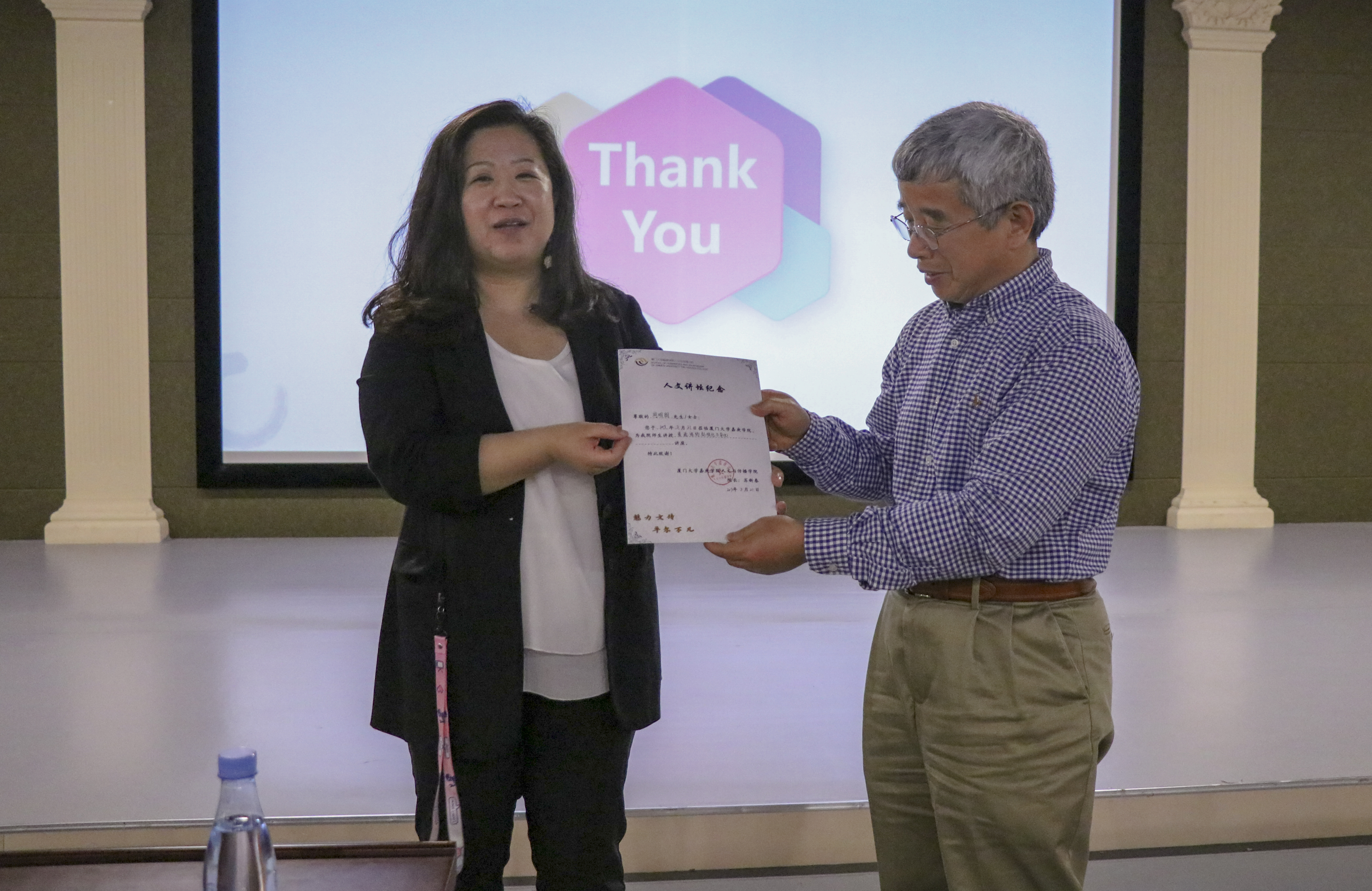 讲座为我院师生呈现了一场丰富生动、深入浅出的社会语言学理论分析过程。讲座后杜晶晶副教授代表两岸语用中心、人文与传播学院向周明朗副教授颁发了讲座证书,并合影留念。