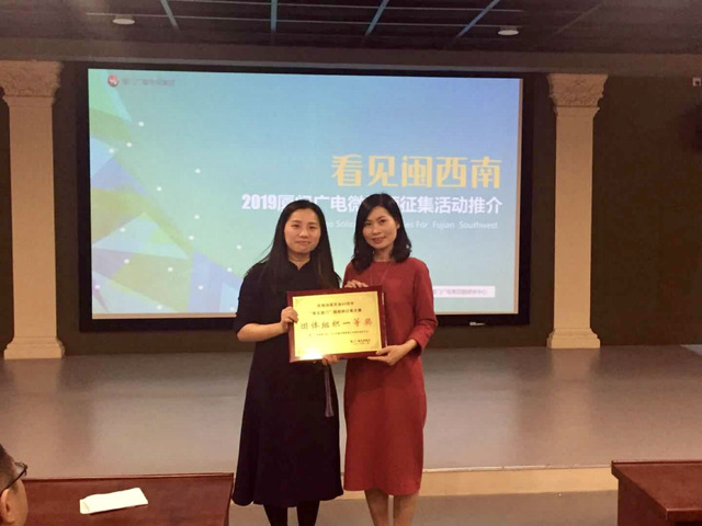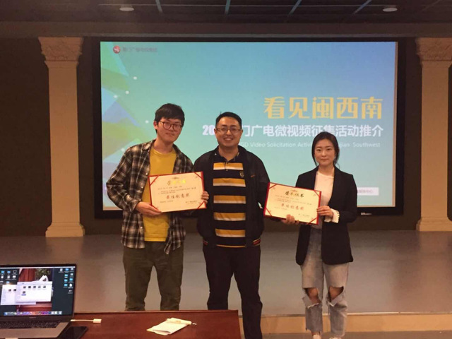 活动一开始,组委会首先为上届“看厦门”微视频征集比赛获奖的各位代表颁奖,人文与传播学院影视艺术中心获得了“团队创作组织一等奖”,并由厦门广电集团融媒体中心副主任郑红女士亲自颁奖,而来自学生创作的两个微视频作品《夜动厦门》和《21摄氏度》分别获得“看厦门”微视频比赛的“三等奖”以及“最佳创意奖”