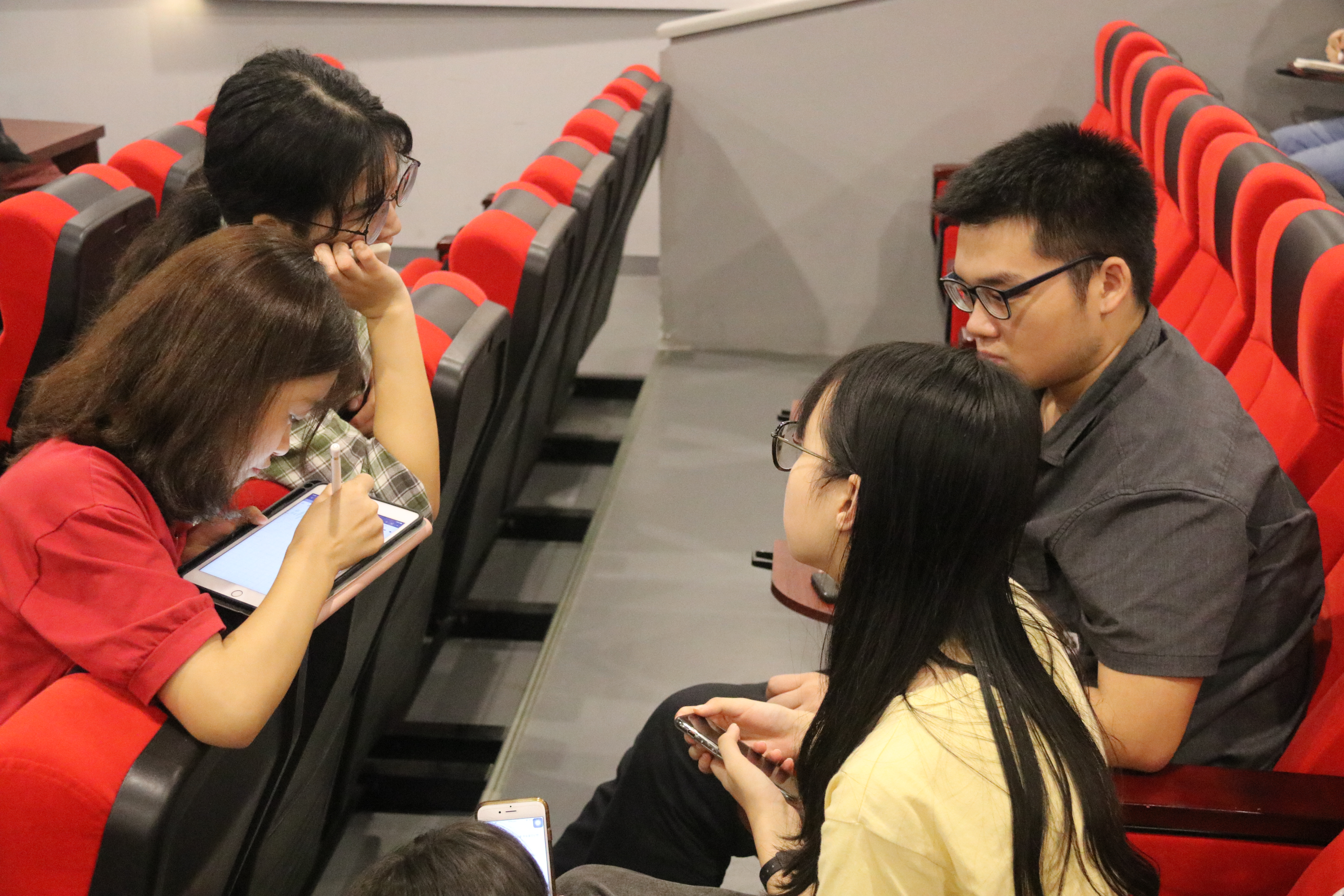 两位创意导师分别上台讲授了广告行业目前颇具挑战性和时效性的传播要求,讲述个人从业十余年来的心得体会,鼓励学生从学会思考和观察,提出“Start with why”、“灵感来自生活”等理念。在自由提问环节,同学们提出了许多困惑与问题,导师们进行一一解答,加深同学们对于创意理念与学习方法的思考。
