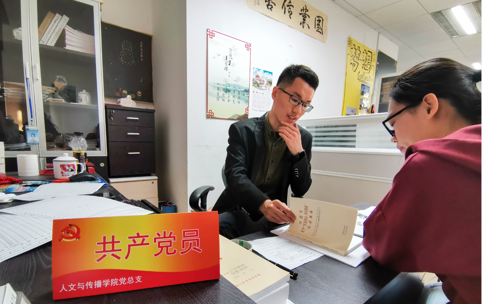 共产党员、学生辅导员张超老师在办公桌上摆放“共产党员”铭牌
