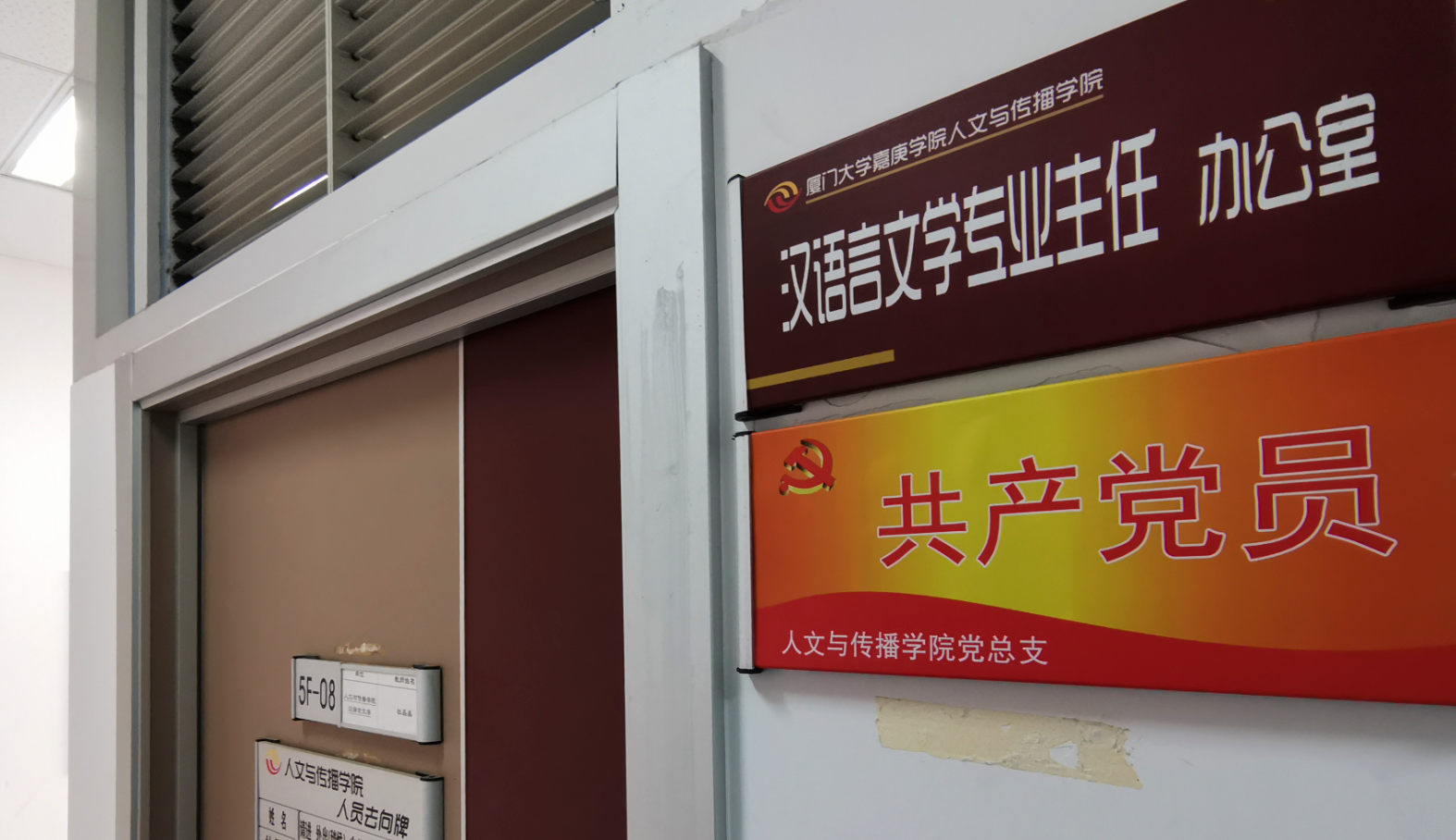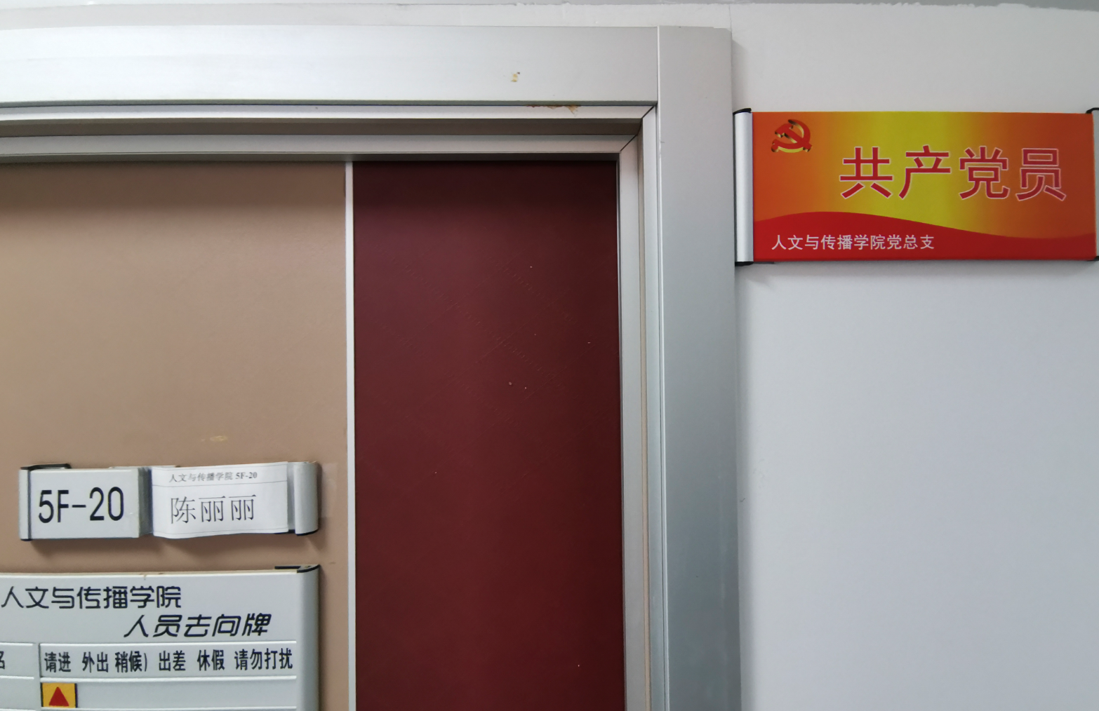 共产党员、广播电视学专任教师陈丽丽老师在办公室门口张贴“共产党员”铭牌