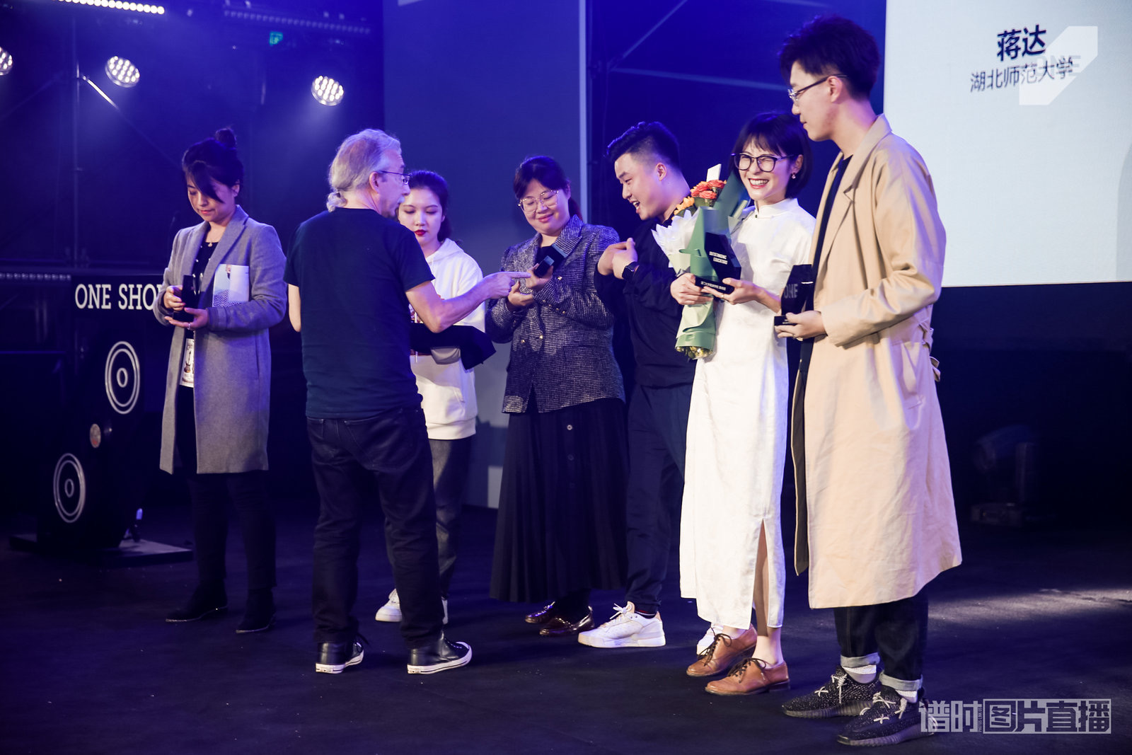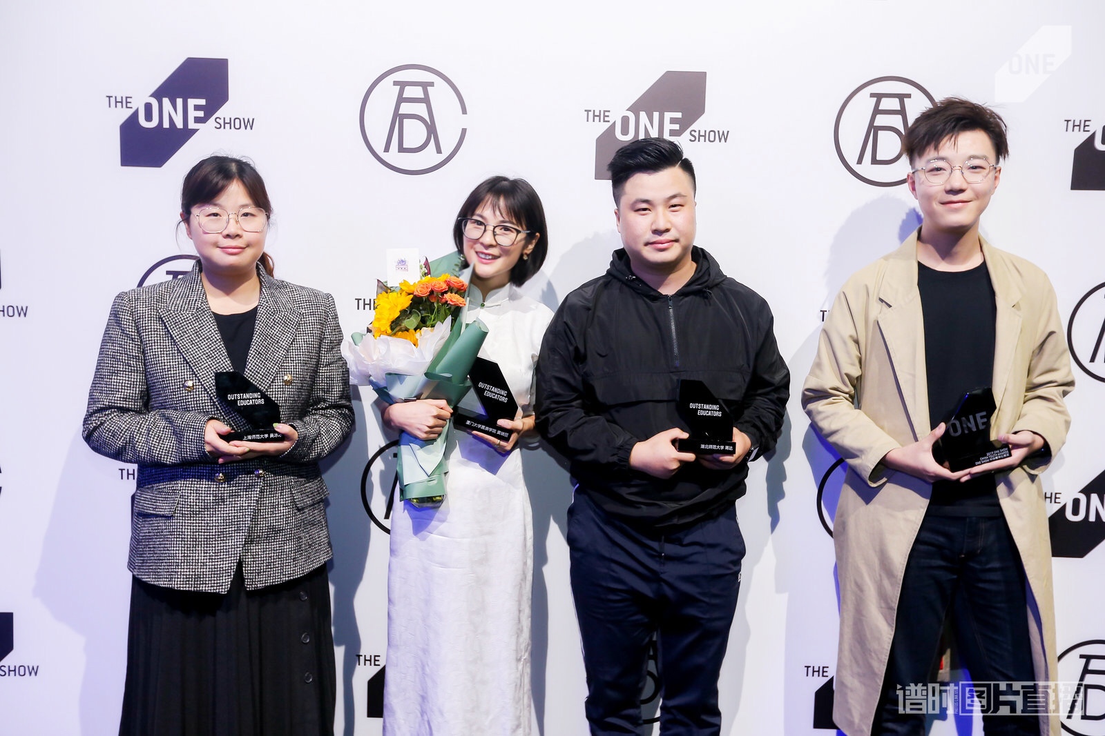 创意导师Larry Chou(右一)为我院获奖同学颁奖,获奖同学从左至右分别是17广电李瑞瑜、17广告郭蕾、18广电吴家伟、18广电彭维新。