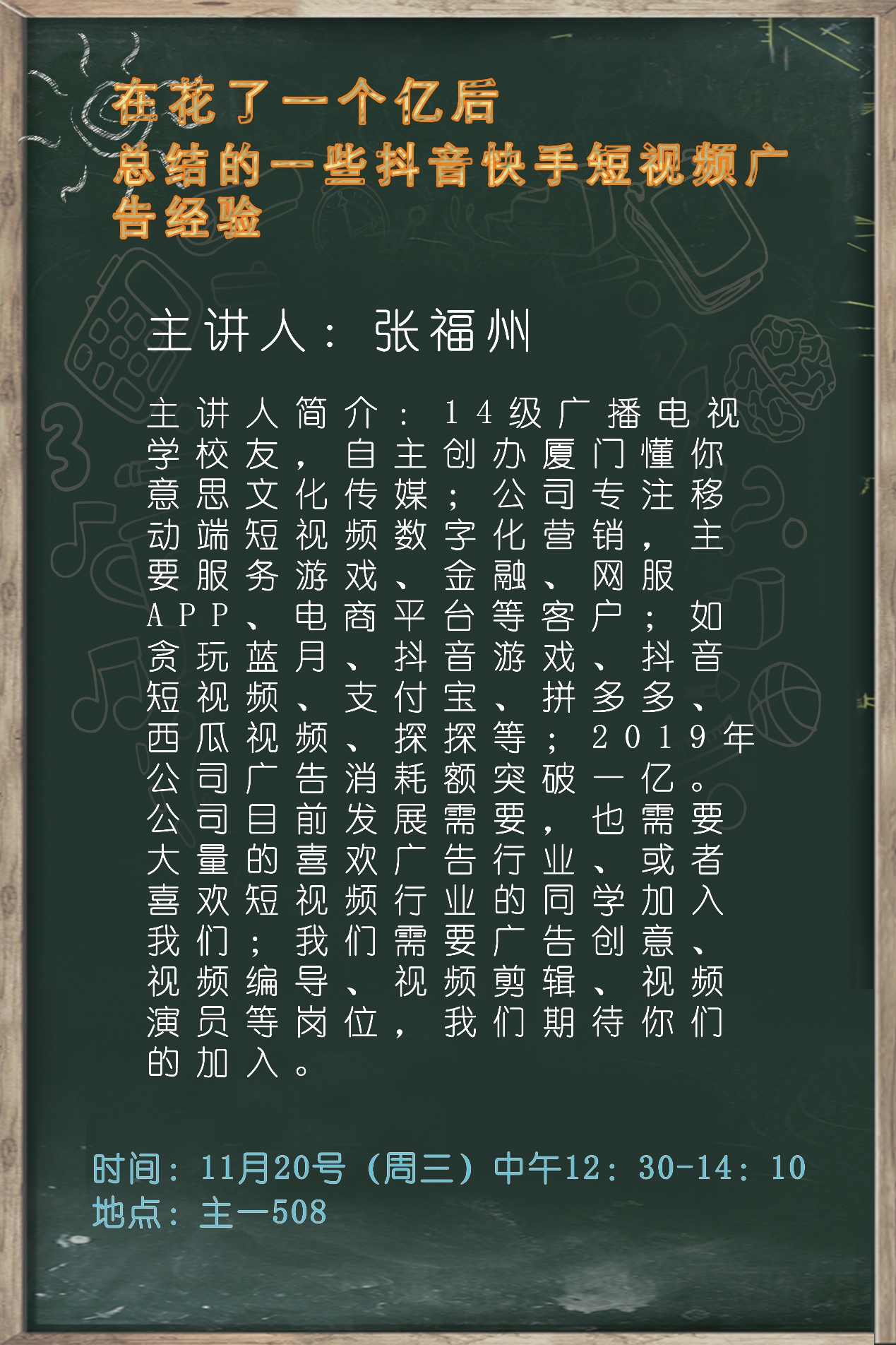 2019年11月20日星期三中午,厦门大学嘉庚学院人文与传播学院2018届广播电视学专业毕业生、厦门懂你意思文化传媒有限公司CEO张福州同学在主一#508会议室,为来自人文与传播学院各专业的学弟学妹们,带来了一场关于“花了一个亿做广告后“的经验分享大会。