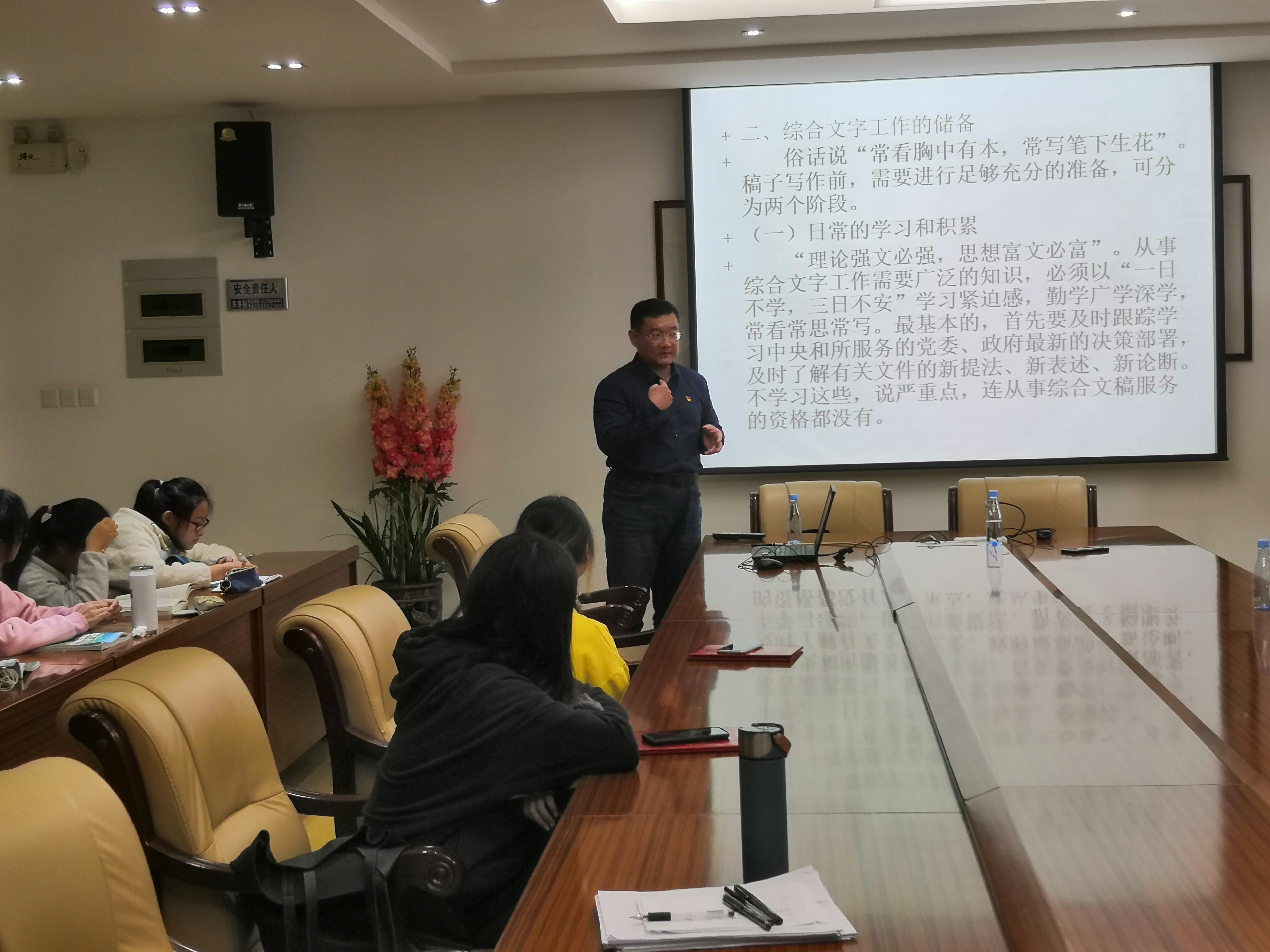 讲座过程中,陈嘉校友结合自己的工作经历就公文的草拟,综合文稿的种类、要求、技巧,进行综合文字工作的注意要点等内容进行了深入梳理,并指出公文写作在公务员工作中的重要性。“要想吃公务员这一碗饭,一定要提升自己的综合文字能力。”陈嘉校友强调,在掌握技巧的基础上,平时的工作中也要不断提升自己各项知识储备以及工作心态,只有这样才能做好公文写作工作。不仅如此,在最后陈嘉校友还与到场的同学们语重心长地说道:“干公务员这一行,需要有使命感与奉献精神,要能吃苦。”提醒同学们要做好心理准备。
