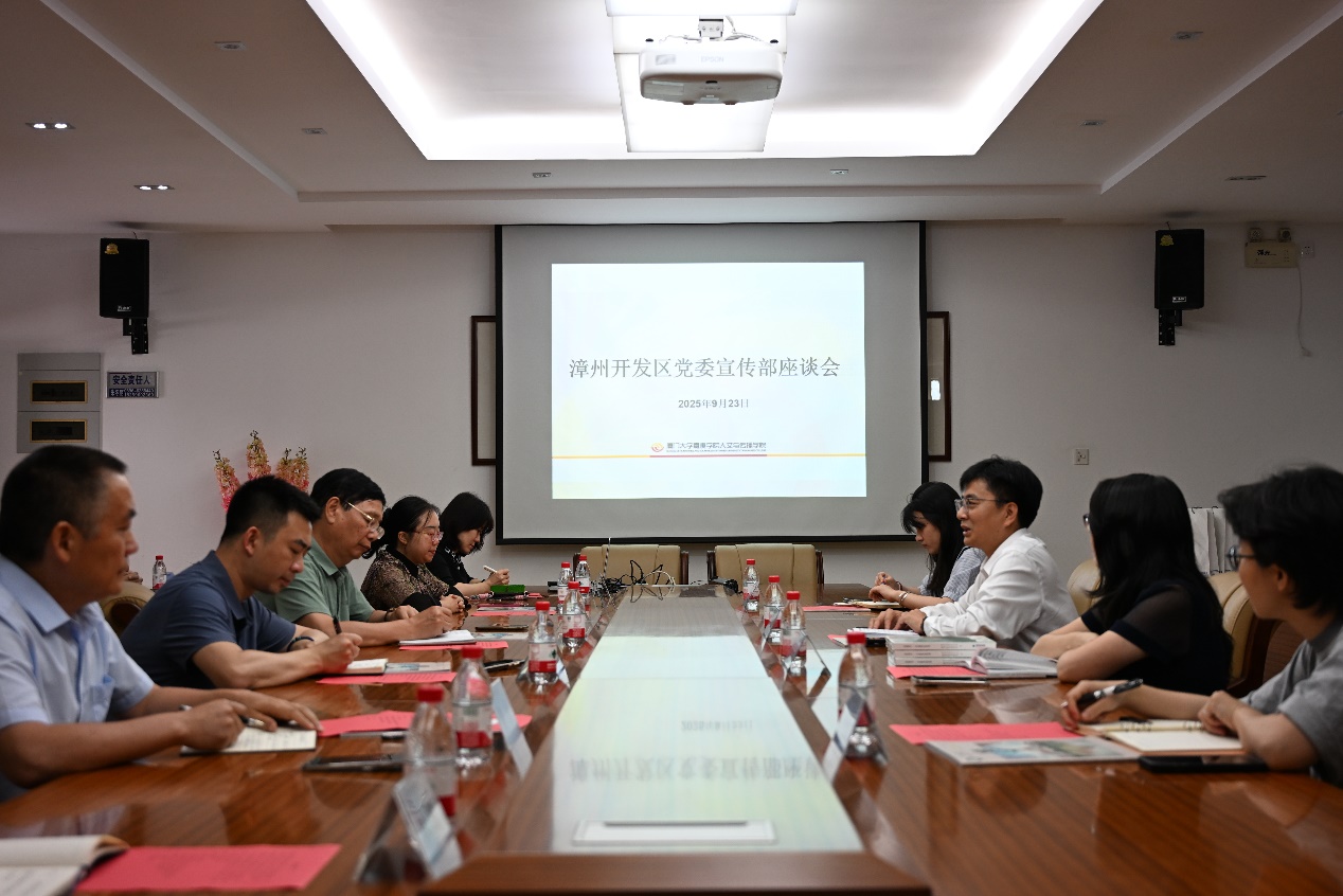 9月23日下午,厦门大学嘉庚学院人文与传播学院与漳州开发区党委宣传部座谈会在厦门大学嘉庚学院主1#508会议室召开。漳州开发区党委办公室副主任、党委宣传部副部长郑游楚;党委办公室(宣传部)综合文电科、宣教科科长杨育艳一行,人文与传播学院院长苏新春,设计与创意学院院长林波,我院党总支书记易欣、副院长朱盈蓓、邓葳、广播电视学专业主任林筠、办公室主任孙海岛出席会议,会议由人文与传播学院院长苏新春主持。