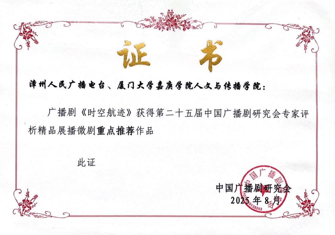 近日,中国广播剧研究会第二十五届中国广播剧专家评析活动在广东省江门市圆满落幕。厦门大学嘉庚学院人文与传播学院音频研究与创作中心与漳州人民广播电台首次联合创作的微广播剧《时空航迹》,在此次全国性权威活动中脱颖而出,获得重点推荐作品。展现了我院在广播剧创作中的扎实功底与创新活力。