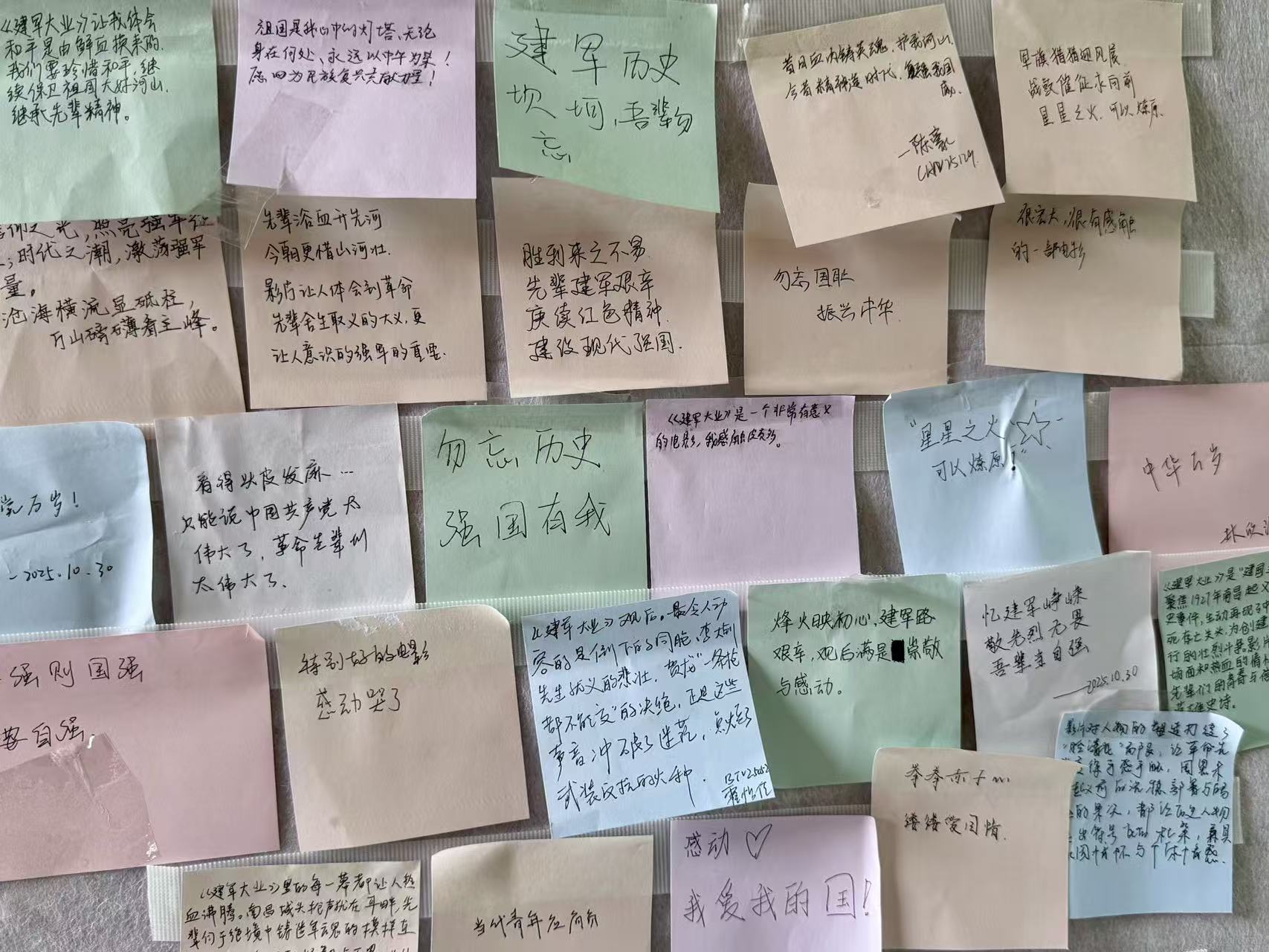 观影结束后,同学们通过便利贴分享感悟,“前辈的血是今天的光”“军装里裹着的是万家灯火”等真挚留言,满含对先烈的崇敬和对和平的珍视。大家纷纷表示,从影片中读懂了历史的厚重,更明确了当代青年的责任。