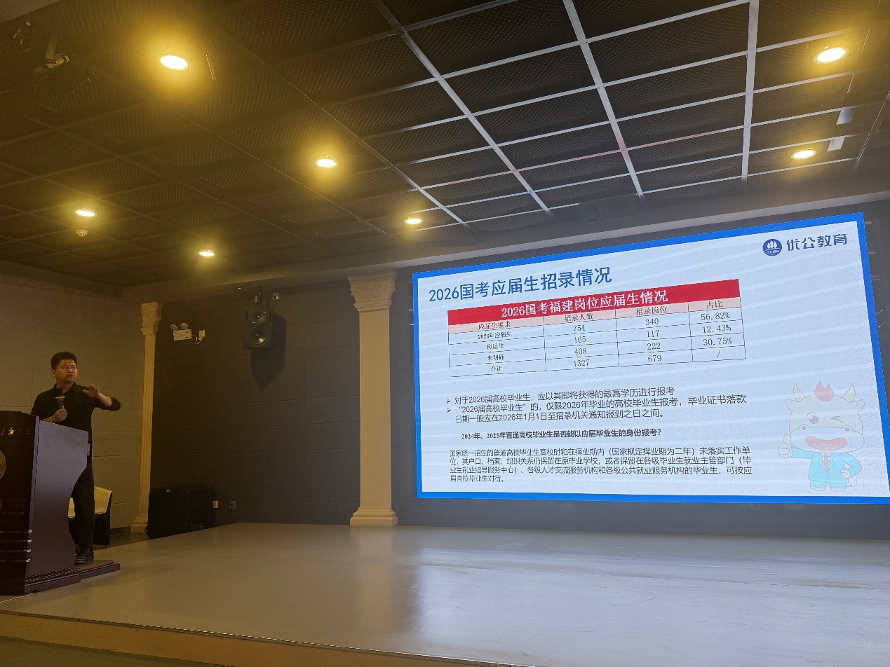 11月12日,人文与传播学院 “公职类考试全程备考规划”指导讲座在主1#517顺利召开。优公教育的黄仕鑫老师为同学们进行了一场系统而深入的全流程梳理,从宏观认知到微观执行,为备考之路点亮了一盏明灯。