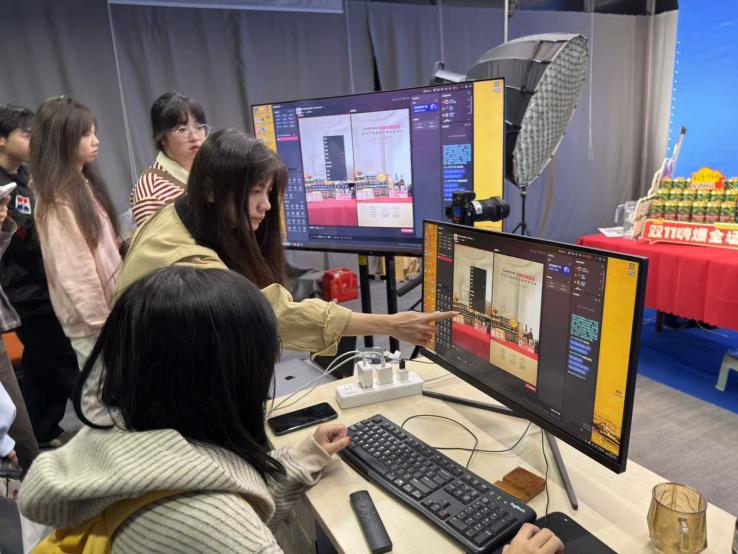 作为北京值得买科技股份有限公司关联企业,厦门有助科技在数字内容制作、新媒体运营等领域拥有丰富实战经验与行业资源。活动现场,该公司三位资深从业者为同学们带来了干货满满的专题分享与实操指导:事业部运营支持部设计专员林静,围绕系统后台如何进行直播间场景搭建展开讲解,从贴片、主题标语、互动内容等视觉风格定位到专业设备调试要点,进行了手把手的指导与操作,让同学们清晰掌握从 0 到 1 打造优质直播场景的核心方法。