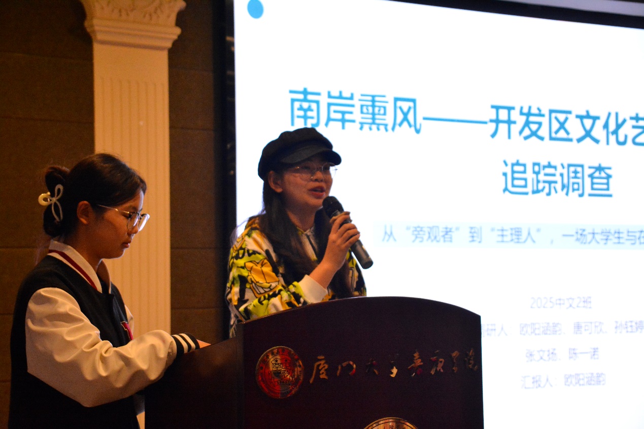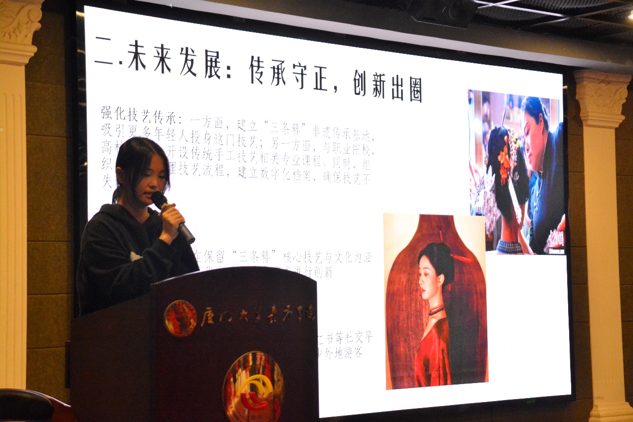 观看本次汇报展后,几位同学分享了他们的感受。2025级汉语言文学专业的孙雅鑫作为第七组汇报成员分享到,本次展示让来自各地的师生通过“福州三条簪”这一具体载体,共同感受并理解了独特的闽都文化情怀,实现了地方传统文化的有效传播。2023级文化产业管理专业的李靳昀熙在交流中谈到:“通过此次展示,我们深刻意识到传统文化与当代生活相融合的必要性与挑战。正因为传统文化底蕴深厚,而当代社会发展迅速,二者的结合已成为必然趋势。这就要求我们必须准确把握传统文化的精髓,立足当下实际需求,让传统智慧真正回应时代命题。”2024级新闻学专业的吴怡霏则表示:“这次联合展示让我在课堂之外获益良多,尤其是对闽南地区文化的介绍,使我对学校所在地的文化底蕴有了更深入的认识,深受启发。”