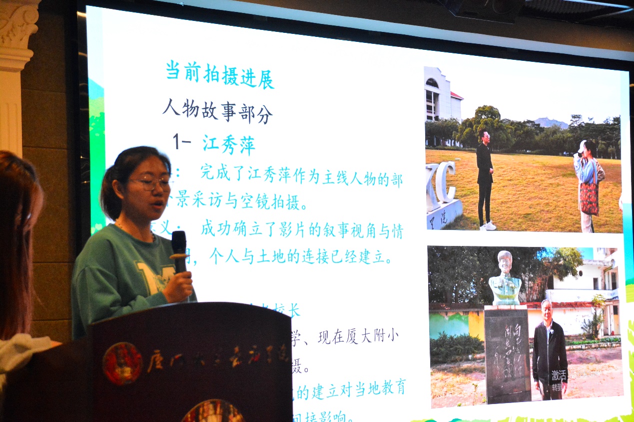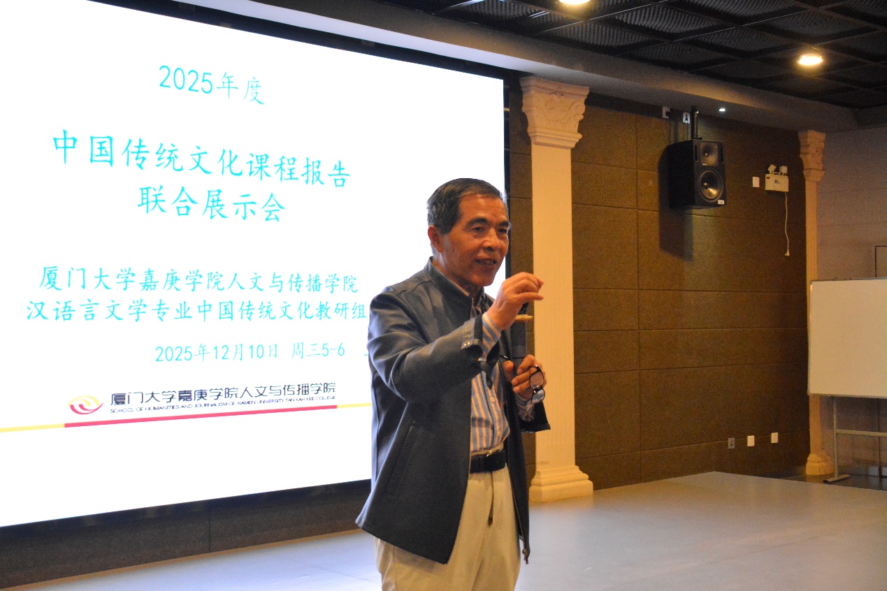 张开焱教授在总结环节中指出,本次联合展示会是一场丰盛的“精神聚餐”。他对同学们的突出表现表示夸赞,其一,是PPT制作用心且精良、具有良好的视觉表达能力;其二,是选题视角贴合课程内涵,兼具学术深度与现实关怀;其三,汇报中普遍注重情感融入与文化精神的传达,使内容充满温度与感染力。而后,他提出了两项建议,第一,深化对学校与周边村落文化关联的探讨,加深文化方面的理解和挖掘。张开焱教授以学校极具特色的建筑风格为例,在学校桂花山上的至善亭,不仅是为了铭记校主陈嘉庚先生来源自《大学》中“止于至善”的校训,也对校园的整体设计和建筑具有统摄性作用。第二,要加强对地方文化实践的调研,深入调查,形成专题。最后,张开焱教授表示,希望此类展示活动能持续举办,它既是同学们阶段性学习的精彩呈现,也是教师们互相启发、共同成长的重要平台。